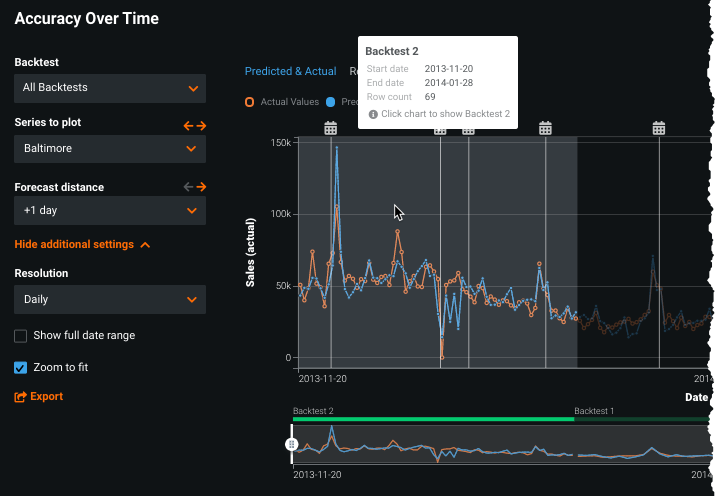 Check Show training data to see the full results using training and validation data. This option is only available when an individual backtest is selected, not when you have selected All Backtests from the Backtest dropdown. The visualization captures not only the weekly variation, but the overall trend. Often with time series datasets the predictions lag slightly, but the Accuracy Over Time tab shows that this model is predicting quite well.