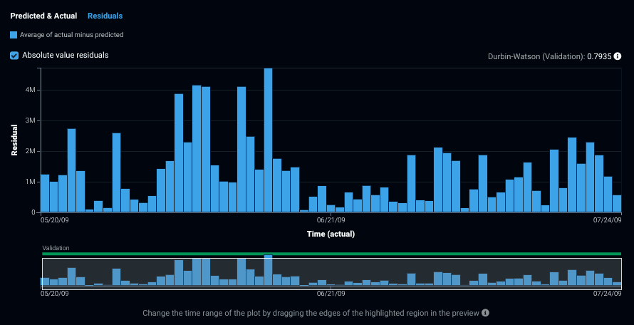 The Residuals chart plots the difference between actual and predicted values. It helps to visualize whether there is an unexplained trend in your data that the model did not account for and how the model errors change over time. Using the same controls as those available for the Predicted & Actual tab, you can modify the display to investigate specific areas of your data.