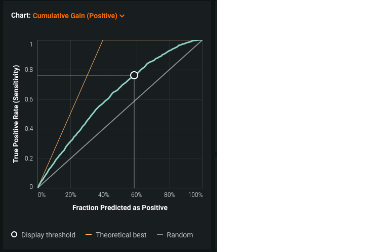 For the Cumulative Gain chart, the Y-axis displays the percentage of the selected class that the model correctly classified with the current threshold (sensitivity for positive selected class, specificity for negative).