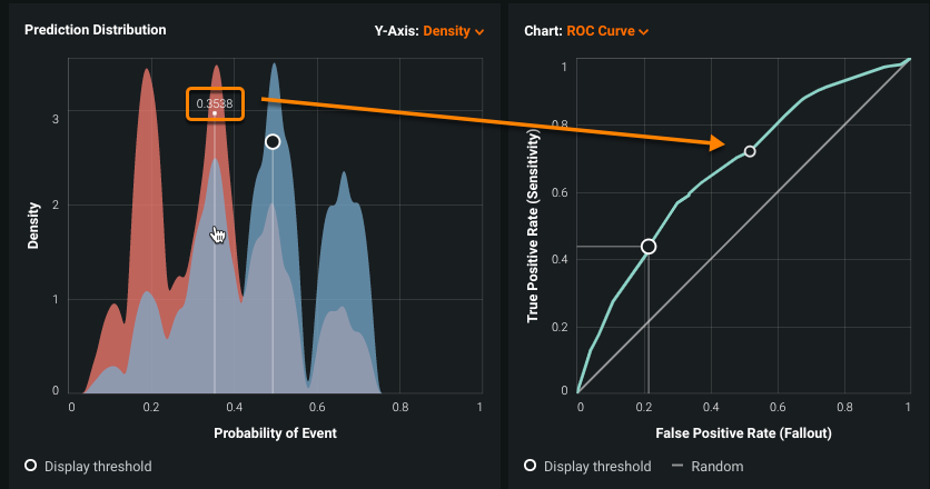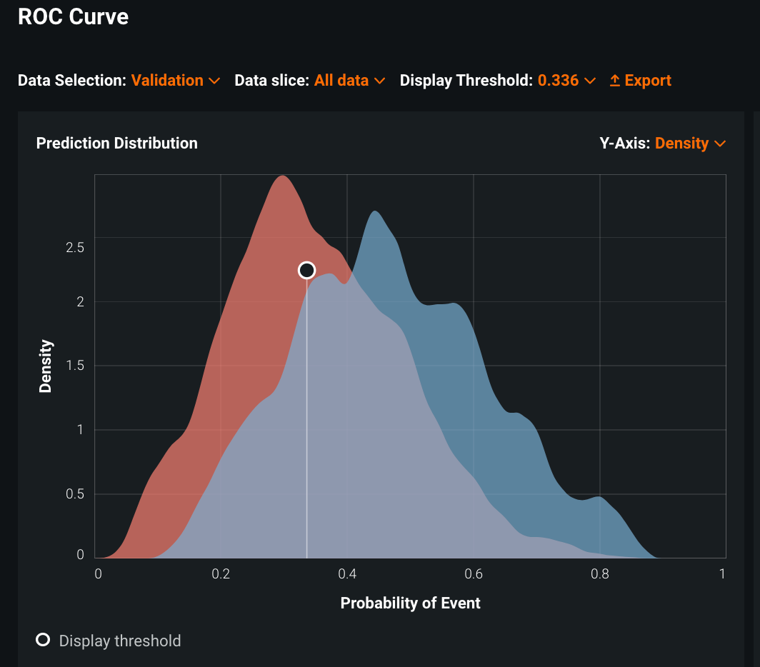 1. Pass your cursor over the Prediction Distribution graph. The threshold value displays in white text as you move your cursor.