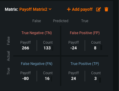 - Payoff values—a set of values that represent business impact (free of currency). For example, "if I identify who will default on a loan, what will the cost or benefit be for each observation for both correct and incorrect predictions?"