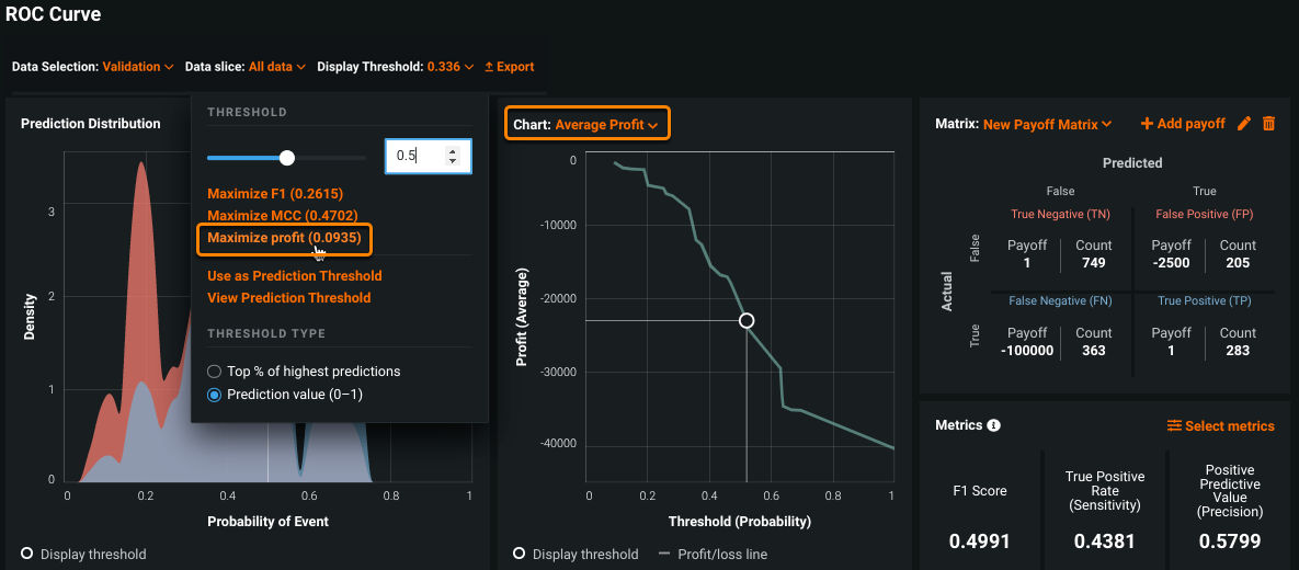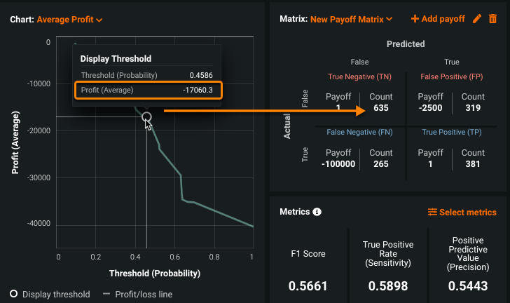 Click the circle on the profit curve to see the average profit at that threshold. Click other areas along the curve to see how the average profit changes. Take a look at the payoff matrix to see how the TN, FP, FN, and TP counts change based on the display threshold.
