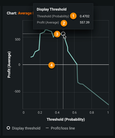 | 3 | Display threshold | Circle that denotes the threshold on the profit curve. You can set the display threshold to the maximum profit by selecting Maximize profit in the Display Threshold pulldown above the Prediction Distribution graph. |