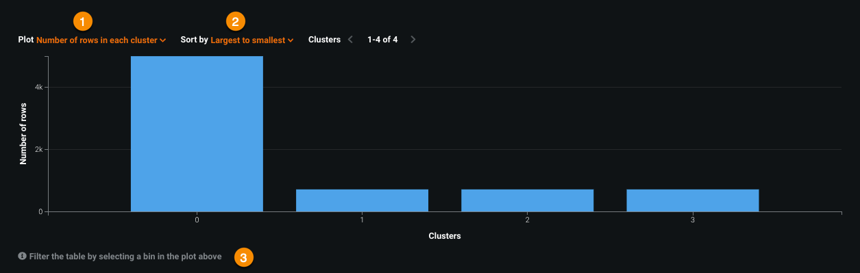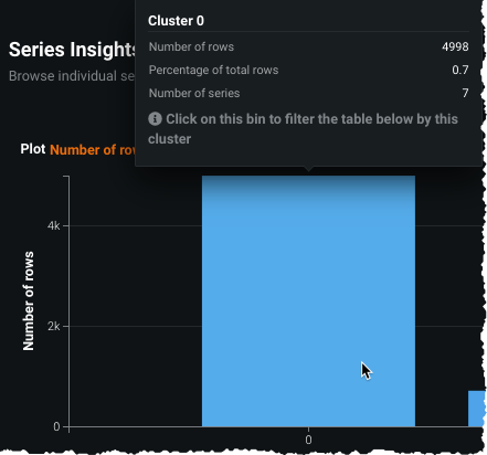 | 1 | Plot | Bins clusters by number of rows, percentage of total rows, or number of series in the cluster. To see all values, hover on a bin. |