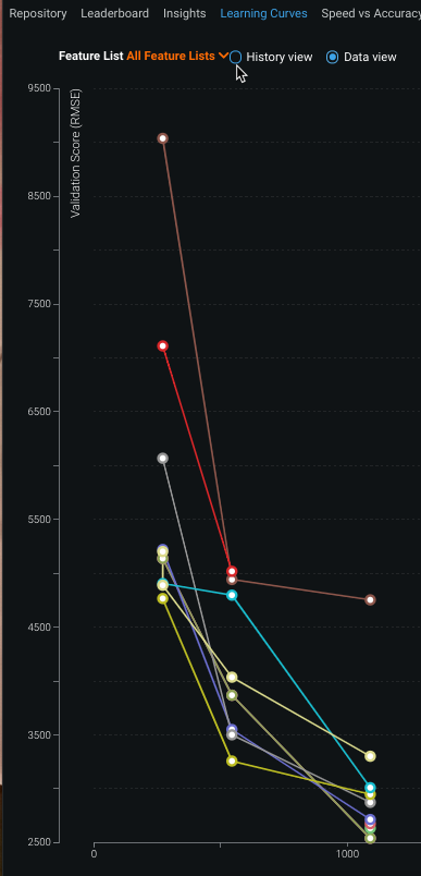 Switch between the views to see the one appropriate for your data. A straight line in history view suggests models were trained on datasets with the same observable history. For example, in Project Settings mode, 25%/50%/100%, if selected randomly, results in a different number or rows but with the same time period (in other words, different data density in the time period). Models that use start/end duration are not included in the Learning Curves graph because you can't directly compare these durations. While using the same time period, it could be from the start or end of the dataset, and applying that against a backtest does not provide comparable results.
