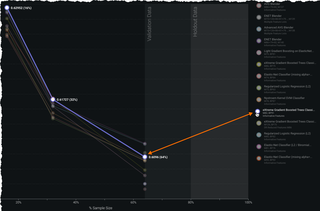 Not all models show three sample sizes in the Learning Curves graph. This is because as DataRobot reruns data with a larger sample size, only the highest scoring models from the previous run progress to the next stage. Additionally, blenders are only run on the highest sample percent (which is determined by partitioning settings). Also, the number of points for a given model depend on the number of rows in your dataset. Small datasets (AutoML and time-aware) also impact the number of stages run and shown.