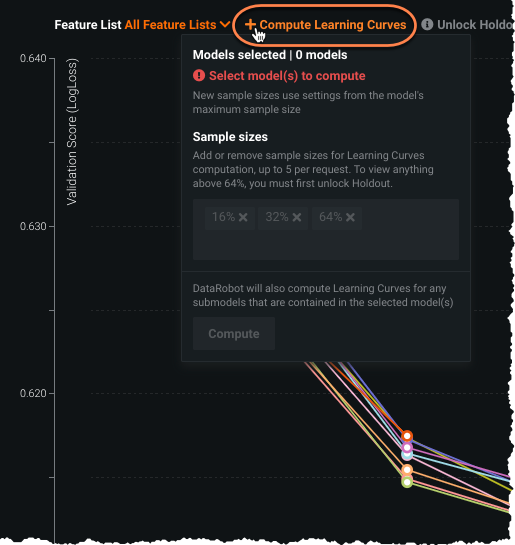 Adding sample sizes and clicking Compute causes DataRobot to recompute for the newly entered sizes. Computation is run for all models, or, if you selected one or more models from the list of the right, only for the selected model(s). While per-request size is limited to five sample sizes, you can display any number of points on the graph (using multiple requests). The sample size values you add via Compute Learning Curves are only remembered and auto-populated for that session; they do not persist if you navigate away from the page. To view anything above 64%, you must first unlock holdout.