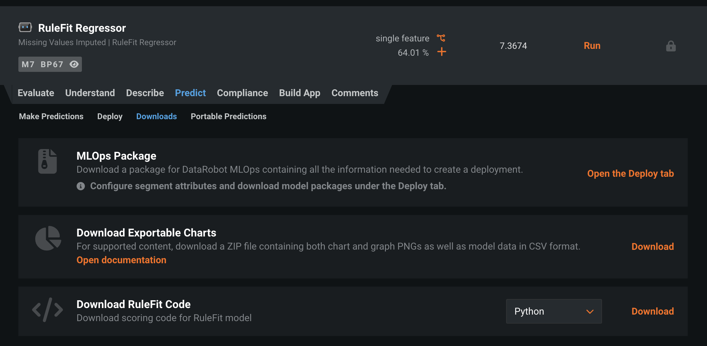 If the Leaderboard contains a RuleFit model (or a deprecated DataRobot Prime model), in the Download RuleFit Code group box, select Python or Java, and then click Download to download the Scoring Code for the RuleFit model: