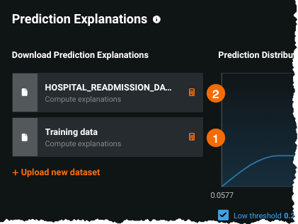 DataRobot automatically previews Prediction Explanations for up to six predictions from your training data's validation set. These are shown in the initial display. You can, however, compute and download explanations for the full project data (1) or for new datasets (2):