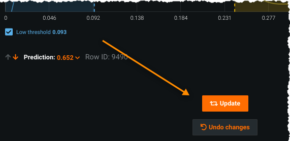 The threshold values demarcate a range in the prediction distribution from which DataRobot pulls the predictions. To change the threshold values, drag the low and/or high threshold bar to your desired location and update the preview.