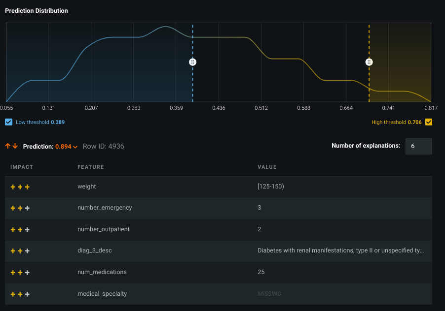 From the example above, you could answer "Why did the model give one of the patients a 89.4% probability of being readmitted?" The explanations indicate that the patient's weight, number of emergency visits (3), and 25 medications all had a strong positive effect on the (also positive) prediction (as well as other reasons).