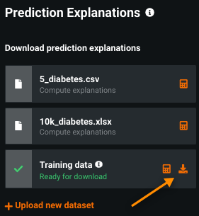 You can generate explanations on predictions from any uploaded dataset. First though, DataRobot must calculate explanations for all predictions, not just the six from the preview. To compute and download predictions once your dataset is uploaded: