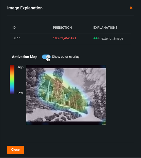 Prediction Explanations for Visual AI projects, also known as Image Explanations, allow you to retrieve explanations for datasets that include features of type "image". Visual AI Image Explanations support all the features described above, with some additions. For explanations size limitations for Visual AI prediction datasets, see the considerations.