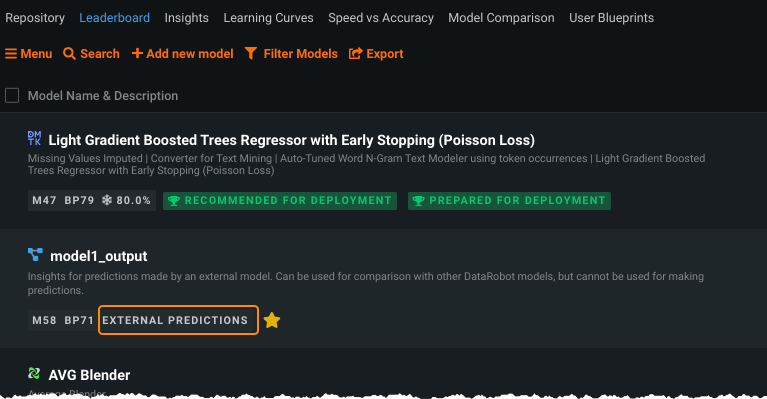 When model building finishes, the model becomes available on the Leaderboard for comparison and further investigation. It is marked with the EXTERNAL PREDICTIONS label: