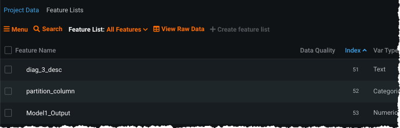 Model1_Output, and select it. Notice in the resulting task setup fields, the feature list and sample size are not available for modification. This is because DataRobot cannot know which features from the training data, or what sample size, were used to train the external model. -