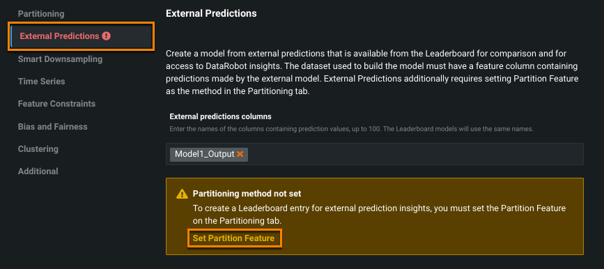 Open the External Predictions tab in advanced options. Enter the external predictions column name(s) from your dataset (up to 100 columns). You are prompted to ensure that Partitioning is set.