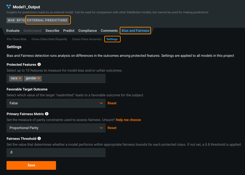 Complete the fields on the Bias and Fairness > Settings page. Click Save and DataRobot retrieves the necessary data.