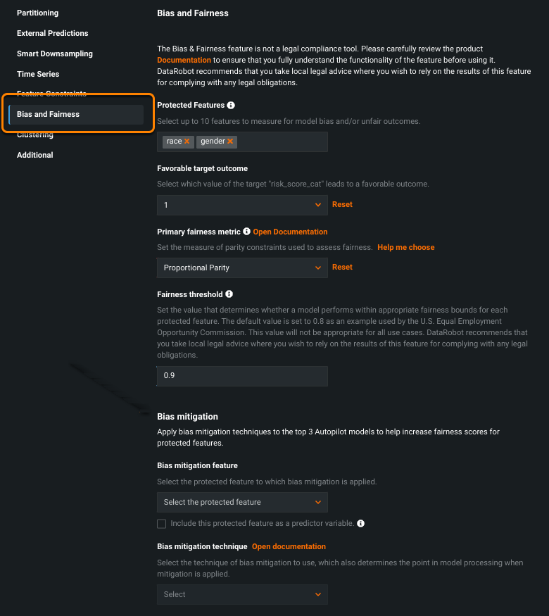 | Bias mitigation technique | Sets the mitigation technique and the point in model processing when mitigation is applied. |