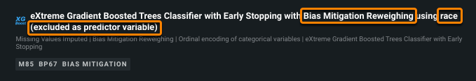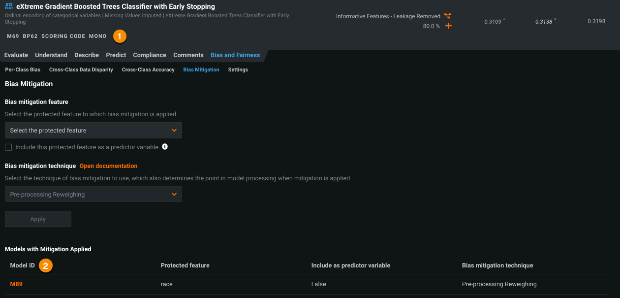 Expand any eligible Leaderboard model and open Bias and Fairness > Bias Mitigation.