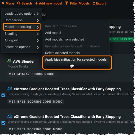 From the menu, select Model processing > Apply bias mitigation for selected models.
