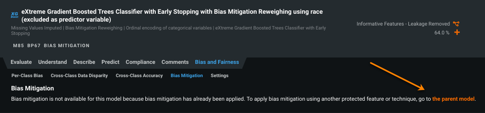 Navigate to the Bias and Fairness > Bias Mitigation tab to retrieve a link to the parent model. Click the link to open the parent.