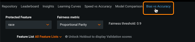 Use the Bias vs Accuracy tab to compare the bias and accuracy of mitigated vs. unmitigated models. The chart will likely show that mitigated models have higher fairness scores (less bias) than their unmitigated version, but with lower accuracy.