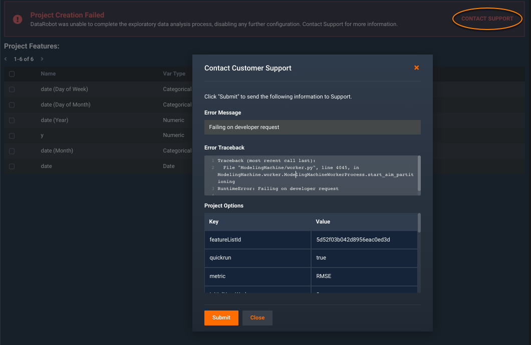 Once dismissed, DataRobot provides a preliminary summary of project data with a message indicating that project creation failed. Click the CONTACT SUPPORT link to see the information available, then click Submit to send the information to the Support team. (For organizations that are not configured for direct contact to Support through the application, clicking the link opens your mail client.)