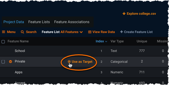 Alternatively, while exploring your data, notice that when you hover over a feature name a Use as Target link appears. Click the link to select that feature as the target.