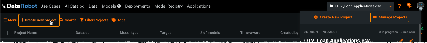 There are two ways to create a new DataRobot project from Manage Projects. Click the DataRobot logo in the upper left corner and then the folder icon in the upper right corner to open the Projects dropdown: