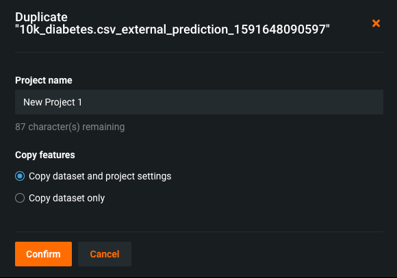 In the resulting dialog, enter a project name and select whether to copy only the dataset or to copy the dataset, the target, and advanced settings and custom feature lists of the original project.