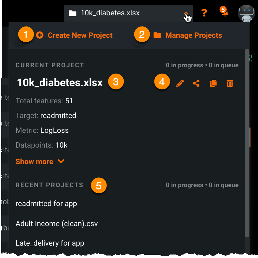 | 1 | Create New Project | Opens the data ingest page, the first step in building a DataRobot project. |