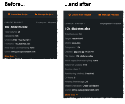 Prior to building models, the summary only reports general information about the project, dataset, and user. After you have built models for a project, the summary reports additional information, including project settings and statistics.