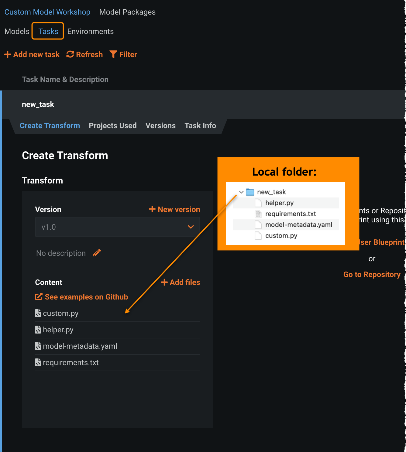 | Additional files | Other files used by the task (for example, a file that defines helper functions used inside custom.py). |