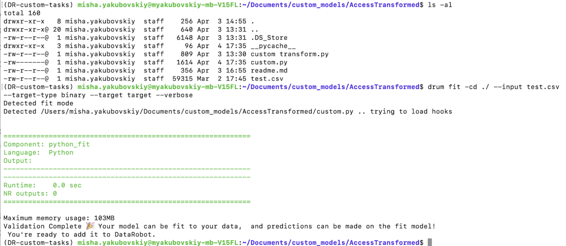 The following provides an example of using drum fit to test whether a task is compatible with DataRobot blueprints. To learn more about using drum fit, type drum fit --help in the command line.