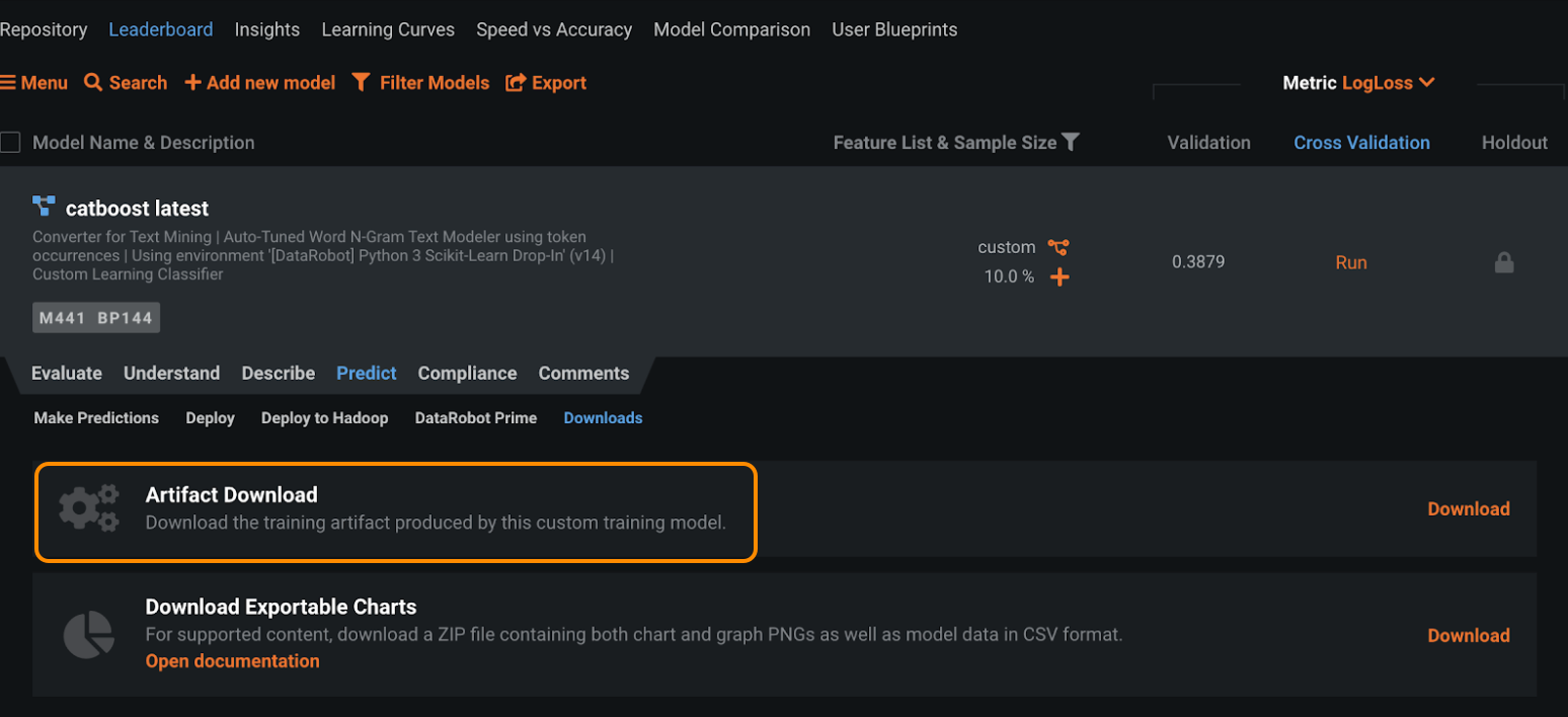 To download an artifact for a model, navigate to Predict > Downloads > Artifact Download.