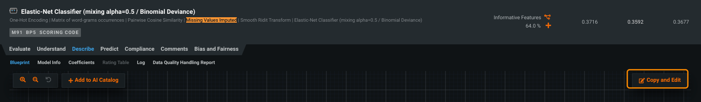 When available, expand a model on the Leaderboard to open the Describe > Blueprint tab. Click Copy and edit to open the blueprint editor, where you can add, replace, or remove tasks from the blueprint (as well as save the blueprint to the AI Catalog).