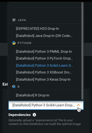 Under Transform Environment, click Base Environment and select [DataRobot] Python 3 Scikit-Learn Drop-In.