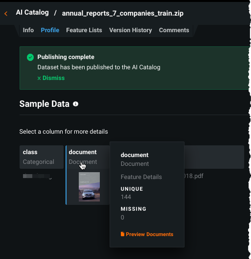 DataRobot also supports base64-encoded strings. For document (and image) datasets, DataRobot converts PDF files to base64 strings and includes them in the dataset file during ingest. After ingest, instead of a ZIP file there is a single CSV file that includes the images and PDF files as base64 strings.