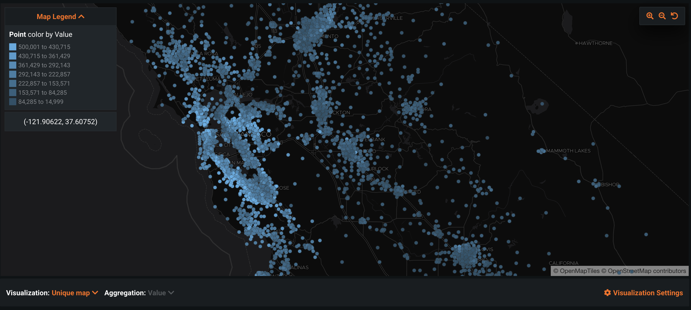 Within the Unique map view, rows from the input dataset that are co-located in space are aggregated; the map legend in the top-left corner of the map panel displays a color gradient that represents counts of co-located points at a given location. Hovering over a geometry produces a pop-up displaying the count of co-located points and the coordinates of the location at that geometry. The opacity of the data can be controlled in Visualization Settings.