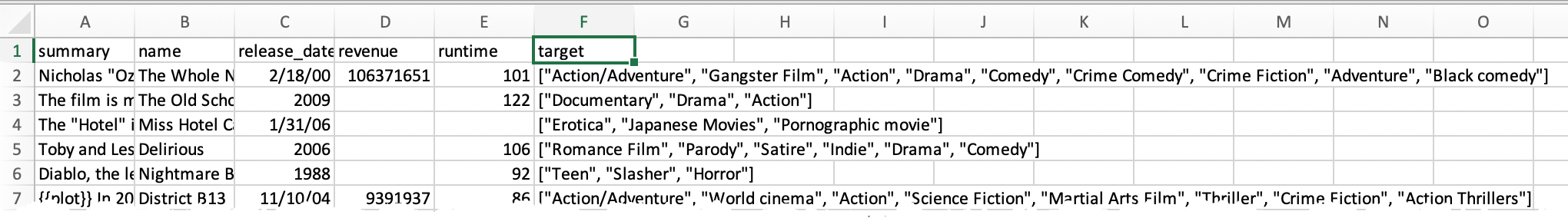 A valid representation of a multicategorical feature in a CSV file looks as follows: