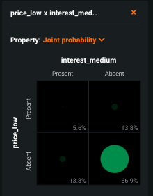 Property for matrix fields Sets the property to be displayed in the matrix: correlation, joint probability, or conditional probability. (See descriptions below.)