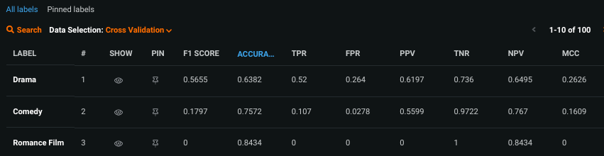 • The ID column (#) is static and allows you to assess, together with sorting, the labels for which the metric of interest is above or below a given value.