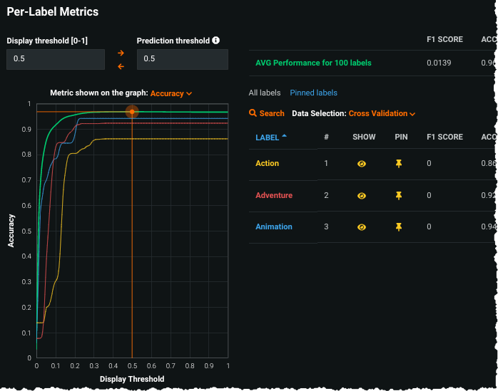 • Displays average and per-label model performance, based on the prediction threshold, for a selectable metric.
