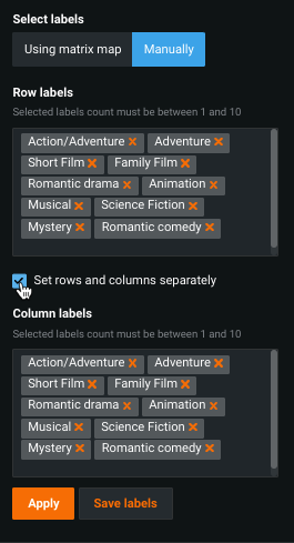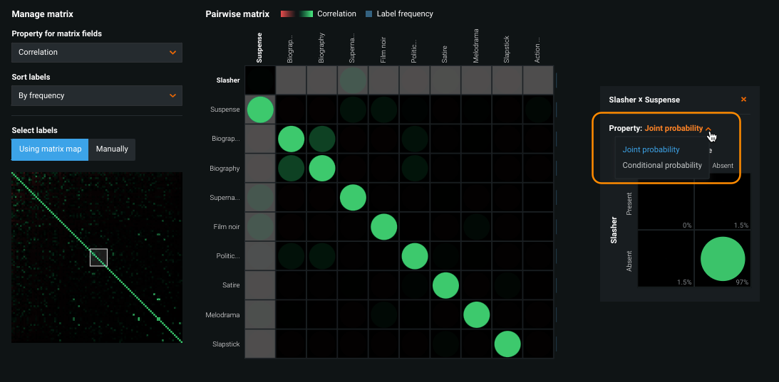 In datasets with more than 20 labels, an additional matrix map displays to the left of the main matrix. Click any point in the map to refocus the main matrix to that area (where the labels you want to investigate converge). The mini-matrix changes to provide more detailed information about the pair. Or, use the dropdowns, described below, to control the matrix display.