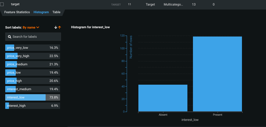 The Histogram provides a bar plot that indicates, for the selected label, the frequency (by number of rows) with which the label is present or absent in the data. Use the histogram to detect imbalanced labels.