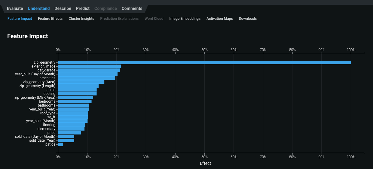 As with supervised projects, DataRobot permutes each feature and looks at how much the prediction changes based on the RMSE metric. The larger the change, the higher the impact of the feature.
