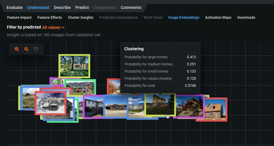 For clustering models, the frame of each image displays in a color that represents the cluster containing the image. Hover over an image to view the probability of the image belonging to each cluster.