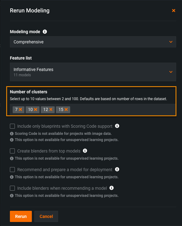 Prior to starting a clustering run, you can customize the number of clusters you want DataRobot to use: