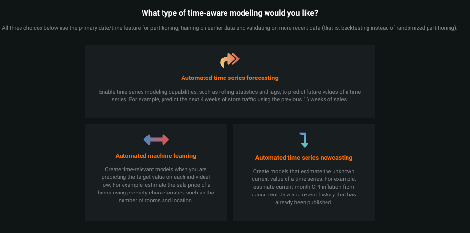 Or, use Automated machine learning (OTV) when your data is time-relevant but you are not forecasting (instead, you are predicting the target value on each individual row). Use this if you have single event data, such as patient intake or loan defaults.