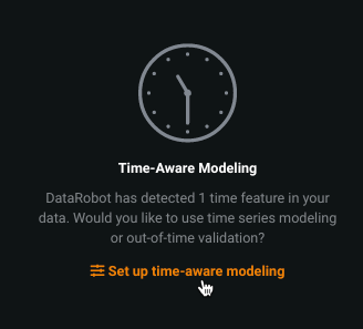 1. Load your dataset and select the target feature. If the dataset contains a date feature, the Set up time-aware modeling link activates. Click the link to get started.